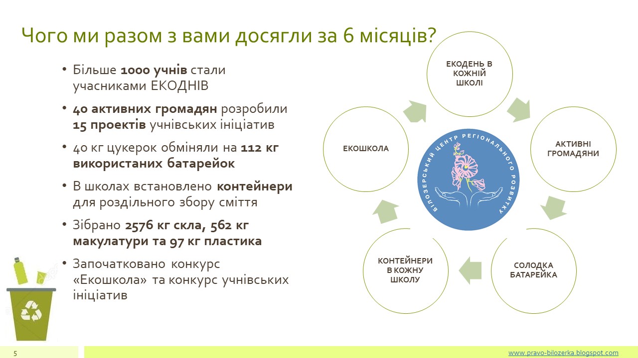Голова організації «Білозерський центр регіонального розвитку» Петренко Елла Євгеніївна підбила підсумки проекту та подякувала партнерам та учасникам за підтримку, ентузіазм та завзяття. Лише в командній роботі можна було досягти таких неймовірних результатів: більше 1000 учнів стали учасниками ЕКОДНІВ, 40 активних громадян розробили 15 проектів учнівських ініціатив, 40 кг цукерок діти обміняли на 112 кг використаних батарейок, в школах встановлено контейнери для роздільного збору сміття, учнями зібрано 2576 кг скла, 562 кг макулатури та 97 кг пластика, започатковано конкурс «Екошкола» та конкурс учнівських ініціатив.