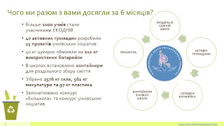 З лютого школи Білозерської ОТГ змагалися за право називатися ЕКОШКОЛОЮ – учні та педагоги вчилися сортувати відходи, збирали їх роздільно у спеціально встановлені контейнери, створювали промоційні відеоролики. Оголошення та нагородження переможців відбулося під час цього заходу.